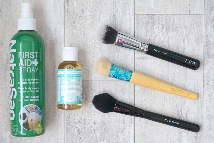 Bacteria loves to breed in makeup brushes, therefore keeping them clean is paramount. Personally I find cleaning my makeup brushes a bit of a chore, so the easier the process the better. There are two products that I like to use; NatraSan First Aid Spray* for everyday cleaning and Dr Bronner Unscented Baby-Mild Pure-Castile Soap for a deep clean.